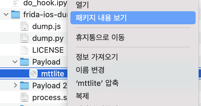 결과로 앱이름.ipa가 생성되고, 이를 앱이름.ipa.zip으로 변경하여 압축해제하면 된다. - 수집한 dump 파일 열기