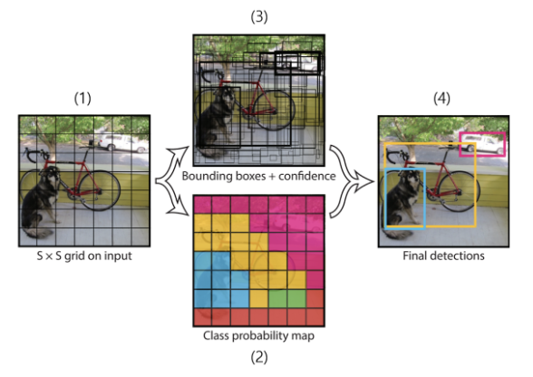 1. 입력한 사진을 가로 세로 동일한 그리드 영역으로 나눈다. (1) 사진에서는 7*7 사이즈 그리드 셀로 구분, 각 셀은 그 셀의 중심에 객체가 있는지를 판별하기 위해 사용됨